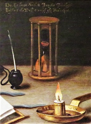 A Vanitas Still Life (c1620), Flint Institue of Arts, Photo by cjverb (2018)-Hourglass & Candle Closeup