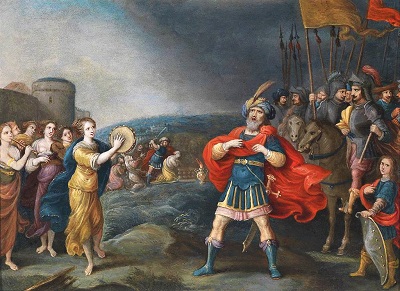 The story of Jephthah’s daughter comes from the Old Testament’s Book of Judges. Jephthah was an Israelite leader, who made a bargain with God. If the Lord delivered him a victory over the Ammonites, Jephthah would sacrifice the first person to come out of his house upon his return. Jephthah and his troops go on to defeat the Ammonites and post-victory they head back home. Catching sight of her long-awaited father, Jephthah’s daughter (she was not named in the Bible) burst from the house to greet him. She danced and shook her tambourine with joy, until she noticed the horror-stricken look on her father’s face.