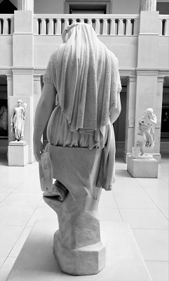 Zoom in and notice the designs on her veil, as well as the embroidery and fringe of her dress. The flowy folds of her clothing are so fluid, so lush it’s easy to forget Ives crafted this beauty from cold, hard marble. Standing before her, I half expected her to heave a shaky sigh. But why you ask, is she to be sacrificed?