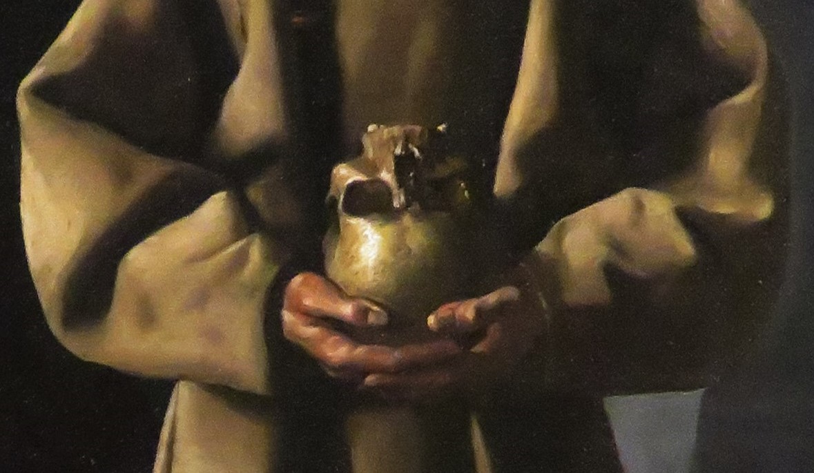 Notice the pointy hood and heavy folds of St. Francis’ Jedi-like cloak. His bearded face, hidden in the shadows contemplates his ghoulish offering. At first glance I thought the golden skull was a chalice. This memento mori is a message to us, the living, to be aware that death is always near. Which adds to the eerie vibe of this painting. Can you hear the Gregorian chant and see the flicker of candlelight inside his drafty crypt? It also begs the question, why is St. Francis visiting his tomb? Is this yet another reminder of our mortality?