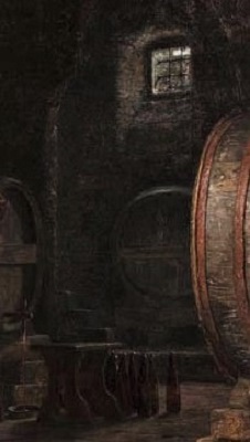 Moving clockwise let’s take a quick tour of the wine cellar starting with the tiny, grated window in the background. Although only a weak amount of light streams in, Grützner does not shirk on the details. Note the silhouettes of a bench, bottles, and other barrels in the shadows.