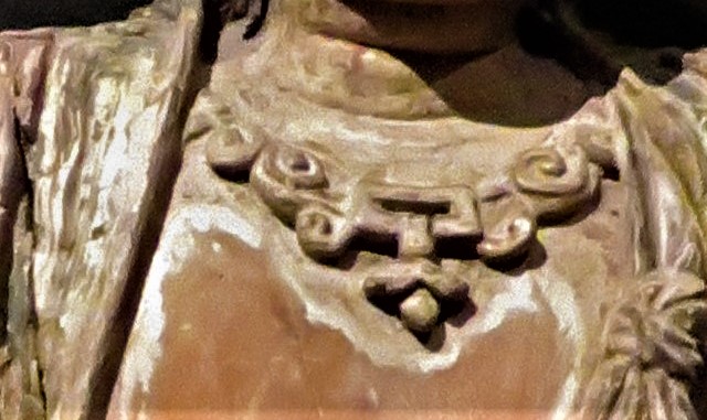 Starting at the top, zoom in and check out Guanyin’s elaborate hair and headdress which includes a bonus mini-Buddha on top. Note too, his fleshy cheeks and somber expression. But don’t be fooled, Guanyin is here to help and no doubt focusing on listening to the trials and tribulations of his worshippers.