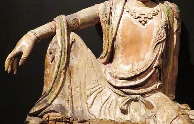 When I stumbled across this lovely statue in the San Diego Museum of Art it made me smile. His impish pose appears playful, friendly, easy going. I could imagine him kicking his right leg back and forth and encouraging me and my fellow museum patrons to come talk, play a game, or have some tea. This laidback vibe was the goal Buddhist artisans hoped to achieve when creating statues of the infinitely compassionate Guanyin.