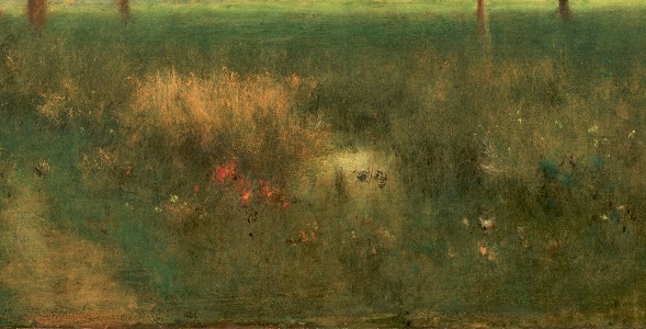 In the distance, a group of buildings, possibly Inness’ Montclair home, is framed by the trees. Check out the play of light and shadow on the grassy field. On the far left, what appear to be livestock graze in the sun. In the foreground, Inness has sprinkled delicate wildflowers in the tall grass.