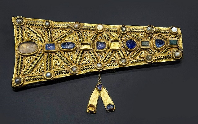 Best known for their sacking of Rome, the Visigoths also produced exquisite metalwork. In addition to their blingy buckles, Visigothic craftsmen also made votive crowns, crucifixes, and jewelry. In 1858, a treasure trove of Visigothic valuables was discovered near Toledo, Spain. Scientists believe the valuables were buried in an effort to hide them from invading Muslims. Click on this Treasure of Guarrazar link to learn more.