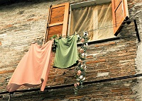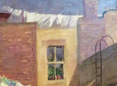 Starting on the right, note the woman hanging her laundry. Notice her flushed face and rolled up sleeves. Concentrating on her task, she has a clothespin clamped between her teeth. Her freshly cleaned clothing dangles precariously between tenement buildings. It is unclear if the basket next to her is freshly dried or another round to hang.