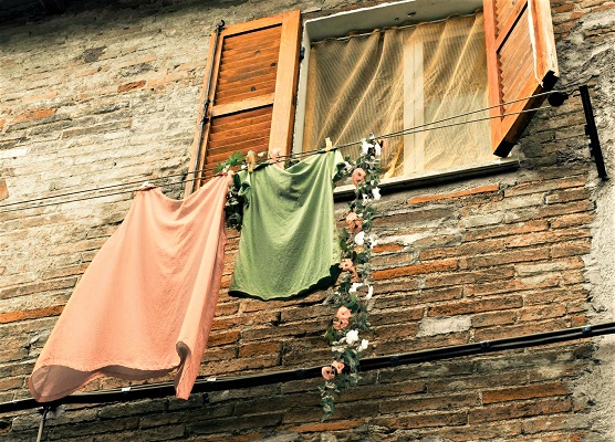A fire escape snakes up and down beside her and shadows from her bleached white laundry decorate the adjacent building. Two windows bracket the clothing and give us a glimpse of what is inside. Potted plants on the upper level, and a kitchen table and chair below. Above in the distance, another set of laundry billows in the wind amidst the chimneys and rooftops.