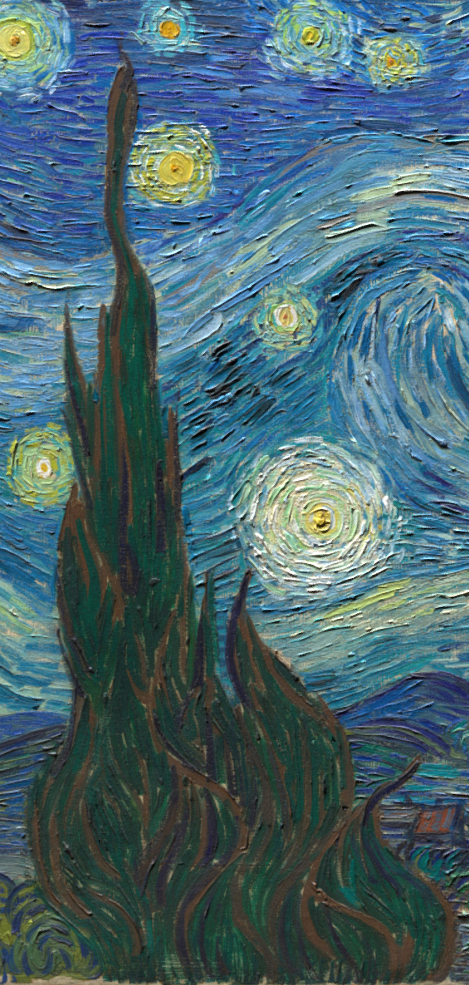 Starting at the top (see image above), notice the swirling night sky dotted with brightly shining stars and a brilliant crescent moon. The large white star (low and to the left of center) is the planet, Venus. The sky and especially the stars are painted with a rough, sometimes gloppy texture. This technique is called impasto and involves applying paint to the canvas with thick, heavy strokes by using a brush, palette knife, or squeezing it directly from the paint tube.