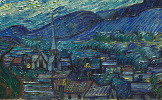 Beneath the blazing sky a sleepy village is nestled among the rolling hills. A soft glow comes from the windows of several houses, but not a single person, aside from the artist, witnesses the drama playing out overhead. Note the brushstrokes on this section of canvas are relatively tame and flat.