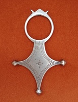 The upper half is comprised of a loop with lobes or ears jutting from the top, while the lower half is diamond-shaped (i.e., a lozenge) with pointed tips. Geometric designs are typically etched into the surface. Note in this example, the etchings along the border, and circles at the center of the lozenge and top of the loop. Since the Cross of Agadez is custom-made, no two are identical. Smiths make variations to the ears, geometric designs, and the shape of the tips, but the form (lozenge and loop) has remained the same for over 100 years.