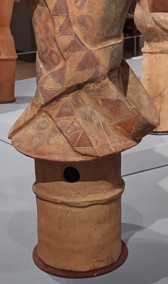 The richness of her clothing and jewelry also signify her high rank. Her dress is painted and incised with geometric designs described by the Tokyo National Museum as “magical patterns”. A cylindrical base provides support where legs and feet are lacking.