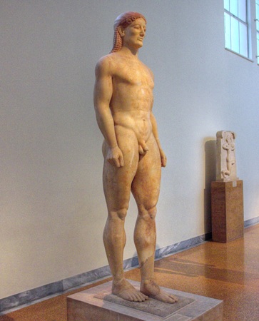 Right: Anavyssos Kouros (c530 BCE; Archaic Style) Hellenic National Archaeological Museum, Photo by Sailko, Wikimedia