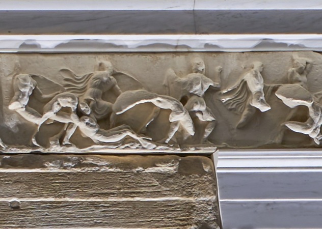 Above the columns, a horizontal band called a frieze, wraps around the temple. Heavily damaged, the frieze features relief carvings of the major gods above the entrance on the eastern side, and intense battle scenes of the Greeks defeating their various enemies on the other sides, most notably their defeat of the Persians at Marathon in 490 BCE.